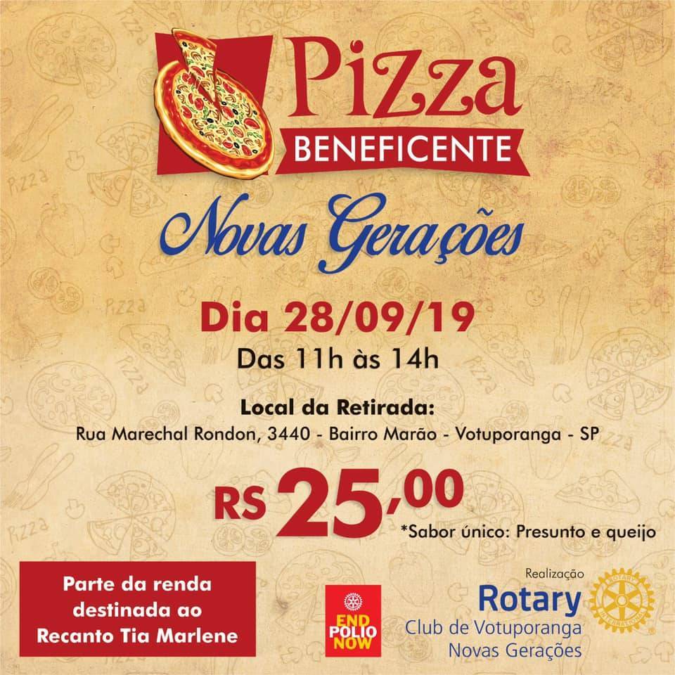 Promoção "Pizza Beneficente Novas Gerações-Votuporanga,com parte da renda destinada à Instituição Recanto Tia Marlene. O evento será realizado dia 28/09/2019 com retirada das pizzas das 11h ás 14h, na rua Marechal Rndon, 3440 Bairro Marão, sede do clube.